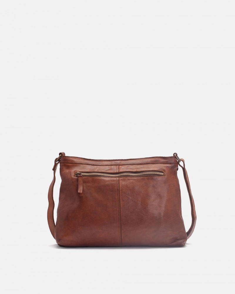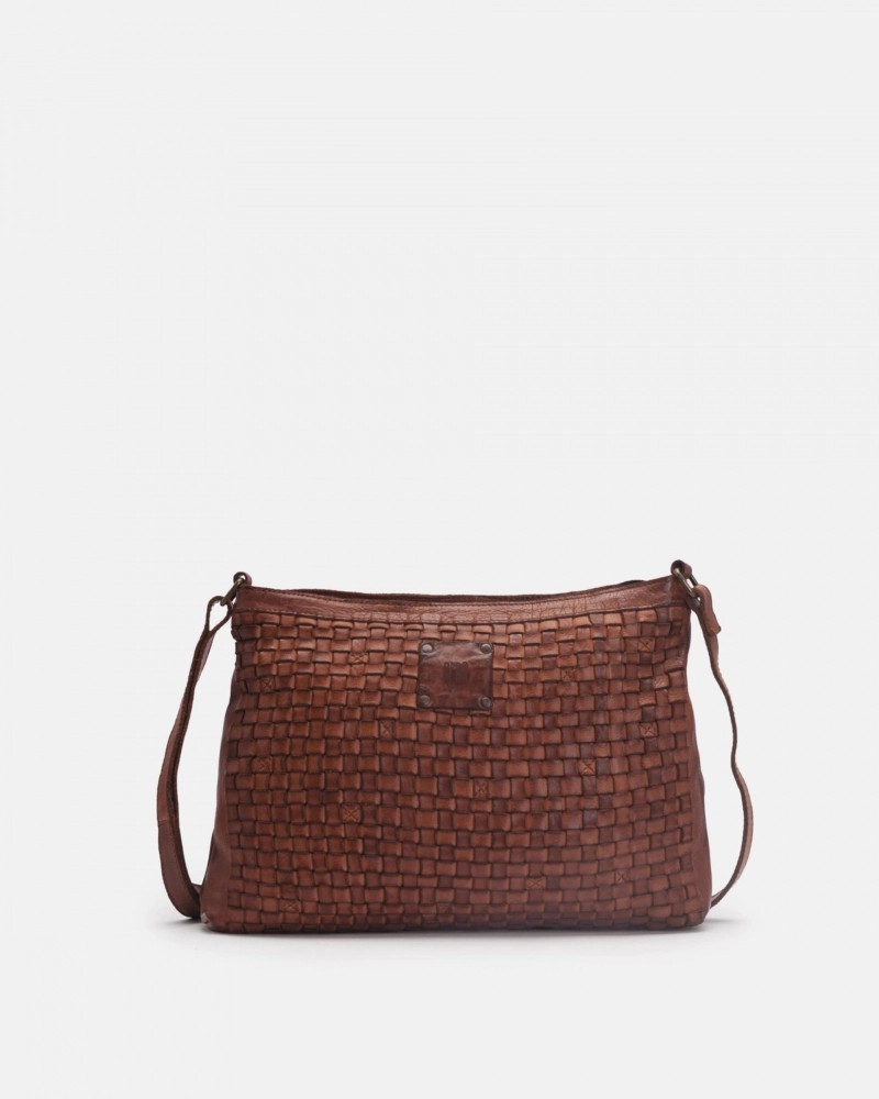 Cross bag de piel vacuna, lavada, de curtición vegetal y trenzado a mano. Cierre con cremallera, bandolera ajustable, bolsillos internos y externos, y forro de algodón.