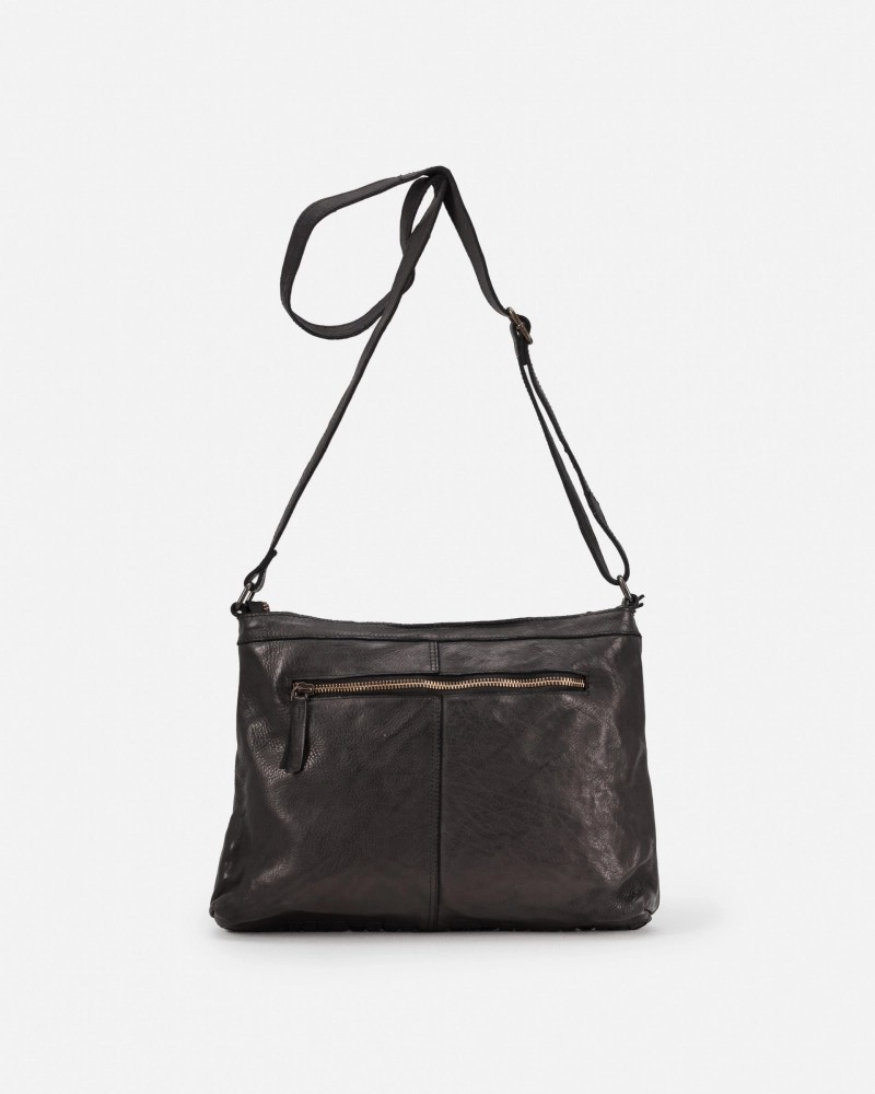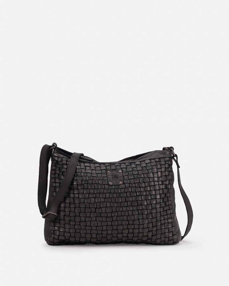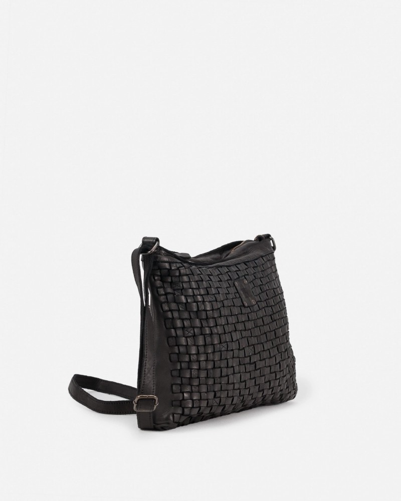 Cross bag de piel vacuna, lavada, de curtición vegetal y trenzado a mano. Cierre con cremallera, bandolera ajustable, bolsillos internos y externos, y forro de algodón.