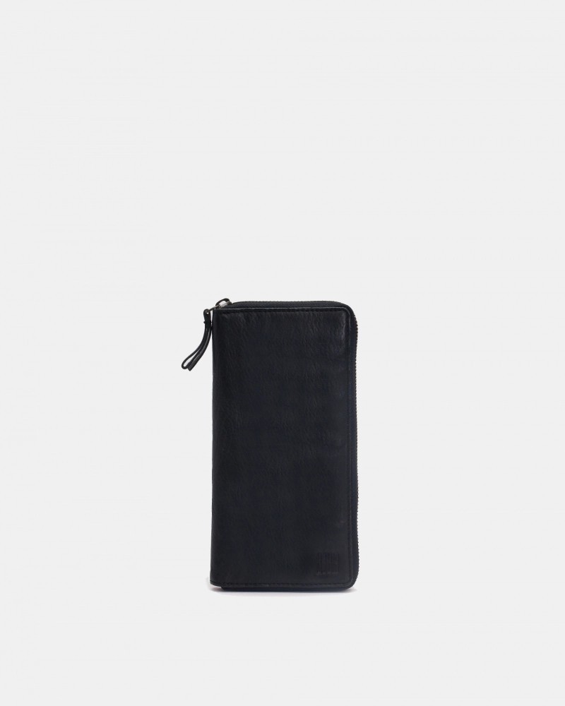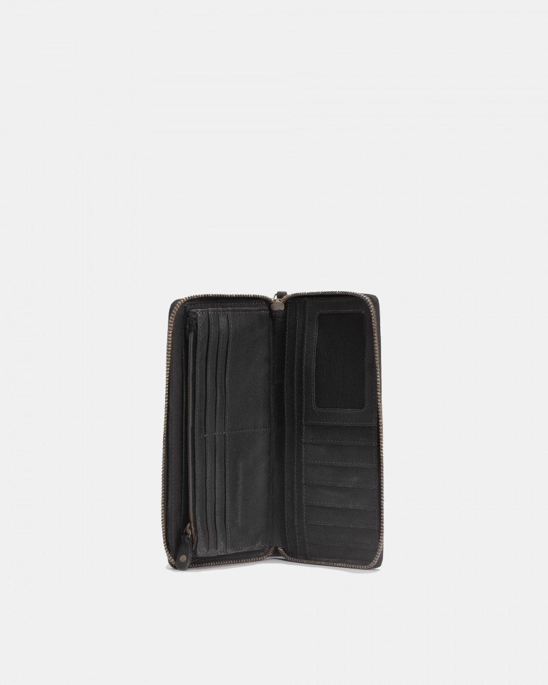 Billetero grande de piel vacuna, lavada, y de curtición vegetal. Cierre con cremallera, compartimientos para tarjetas, billetes, y monedas.