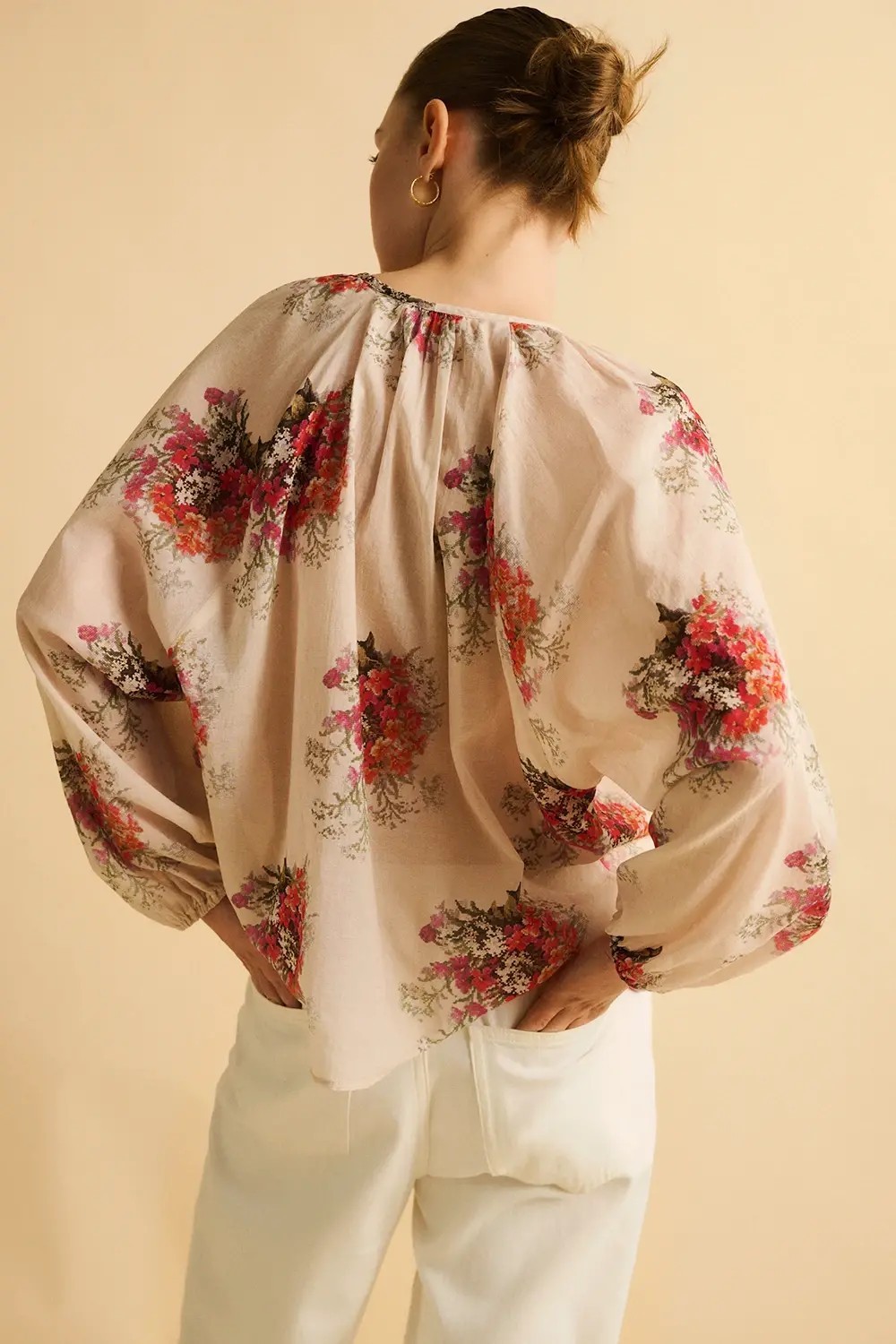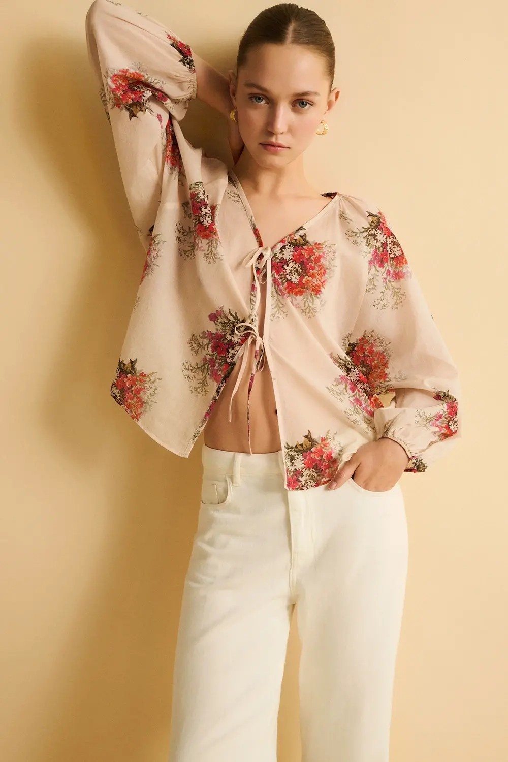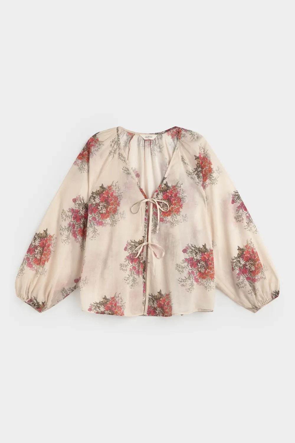 Blusa 100% algodón. Tejido 100% algodón. Diseño con estampado floral. Escote pico. Manga larga raglán. Cierre con lazada en la parte delantera. Fitting recto.