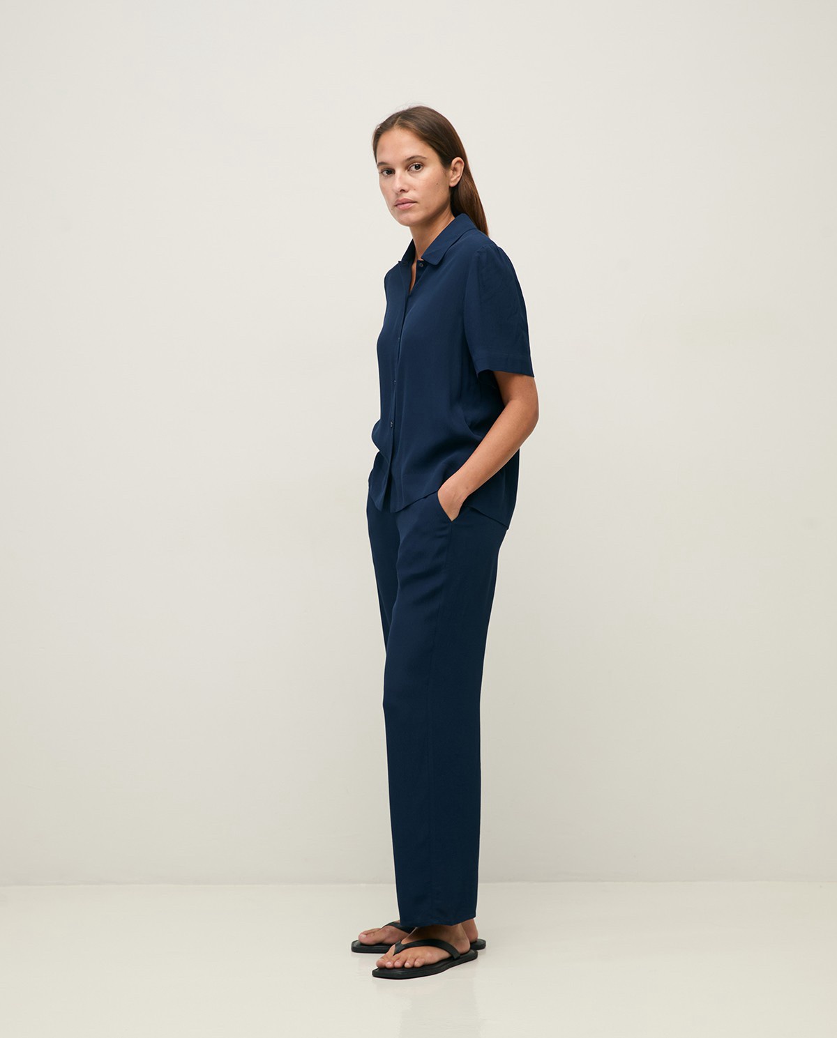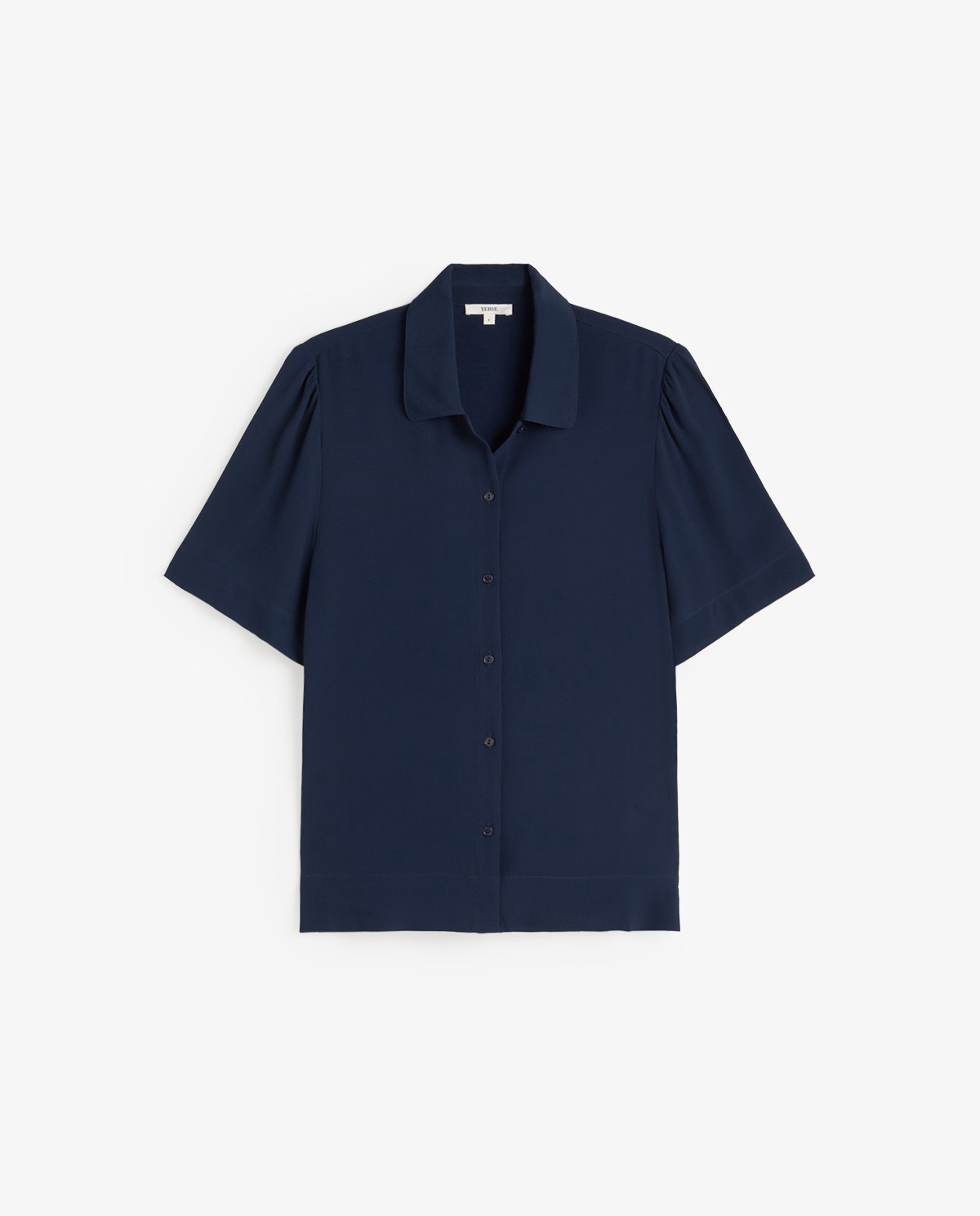 Camisa azul marino. Regular fit. Tejido crepé de viscosa. Cuello camisero. Manga corta. Cierre frontal con botones. Detalle pliegues detrás. Aberturas laterales en bajos. Longitud desde el hombro: 60 cm (talla S).