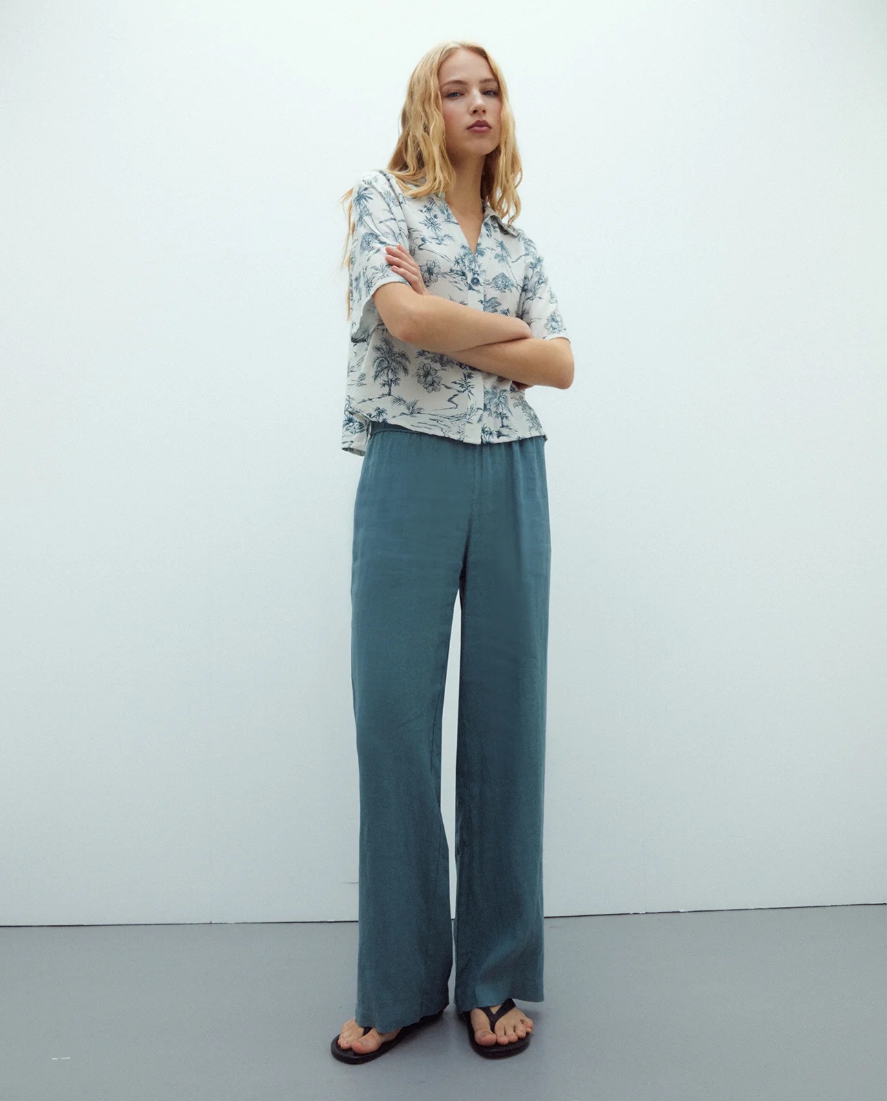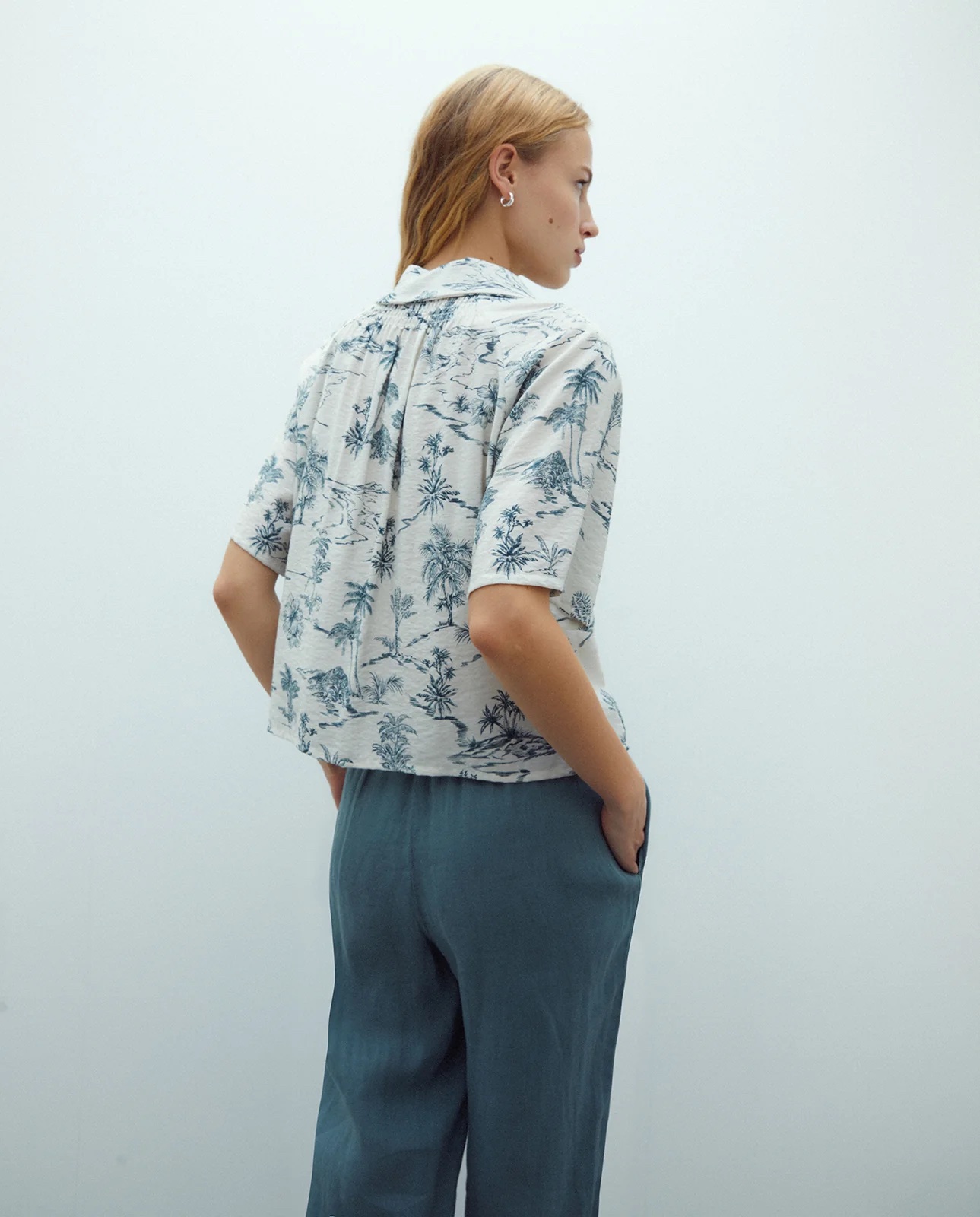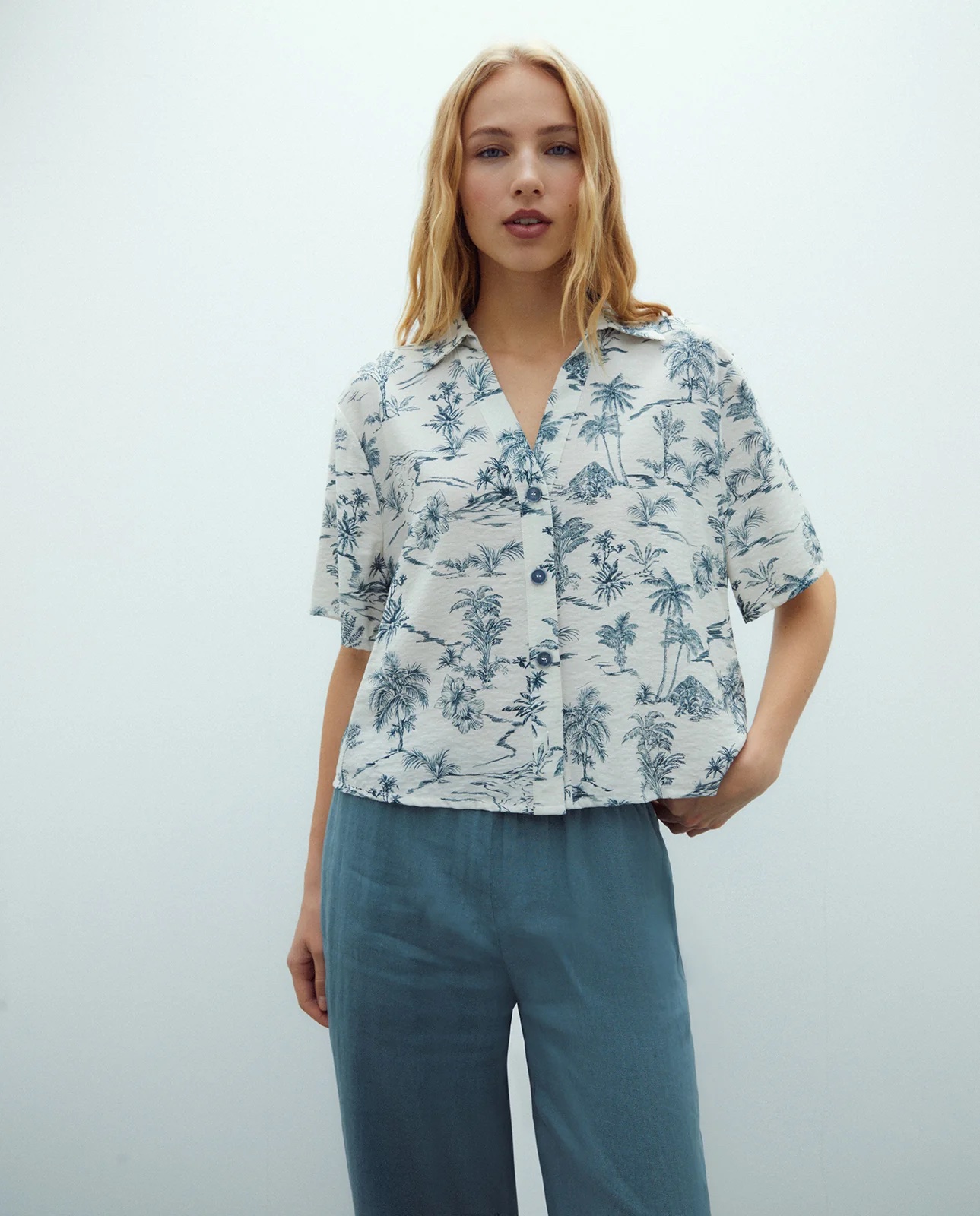 Camisa estampado tropical, con cuello camisero en forma de pico y manga corta. Cierre frontal con botones. Regular fit