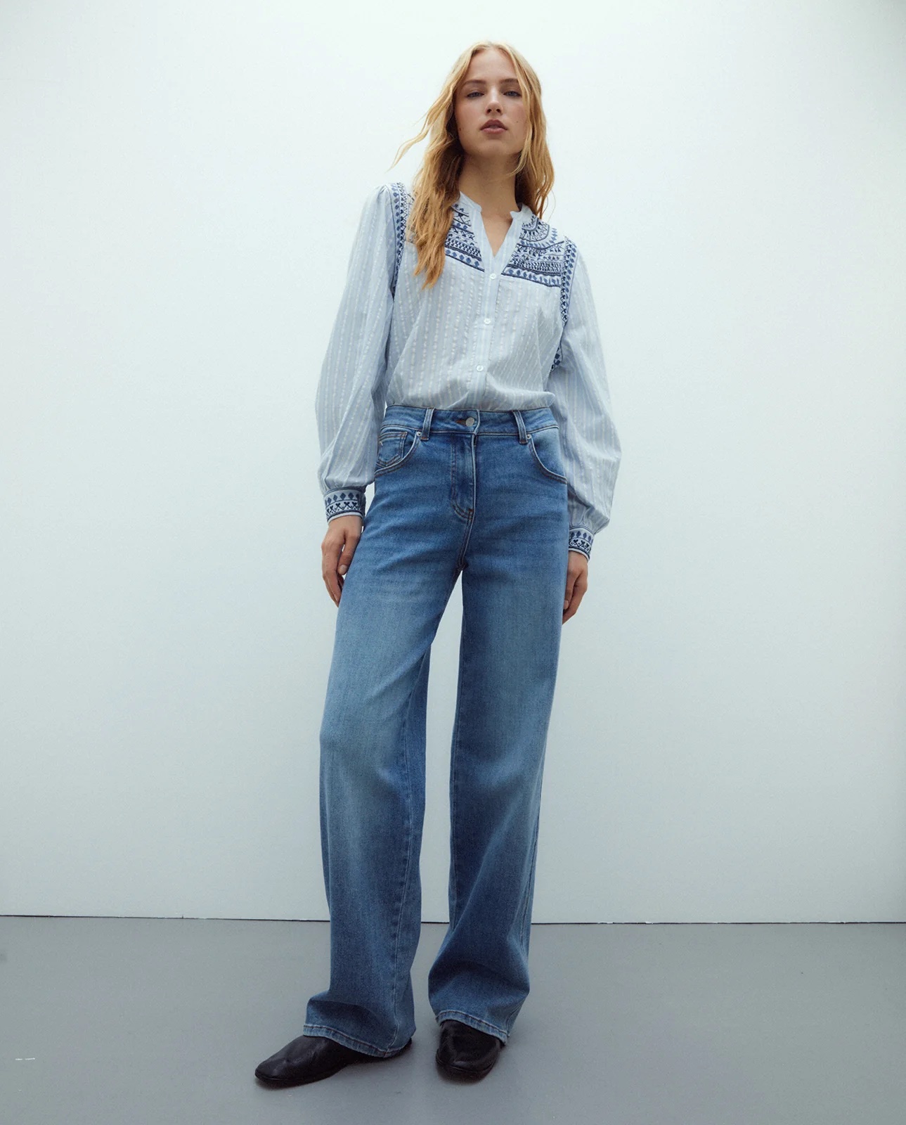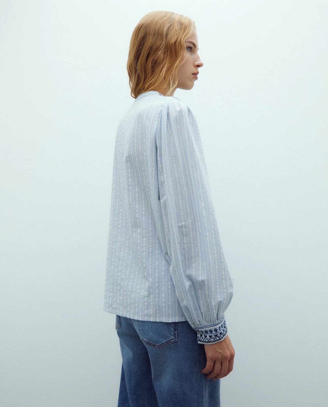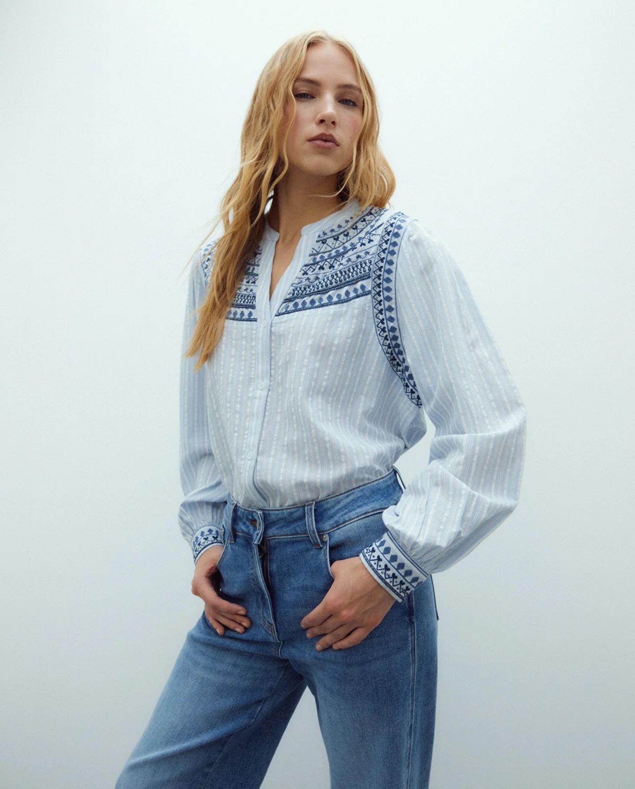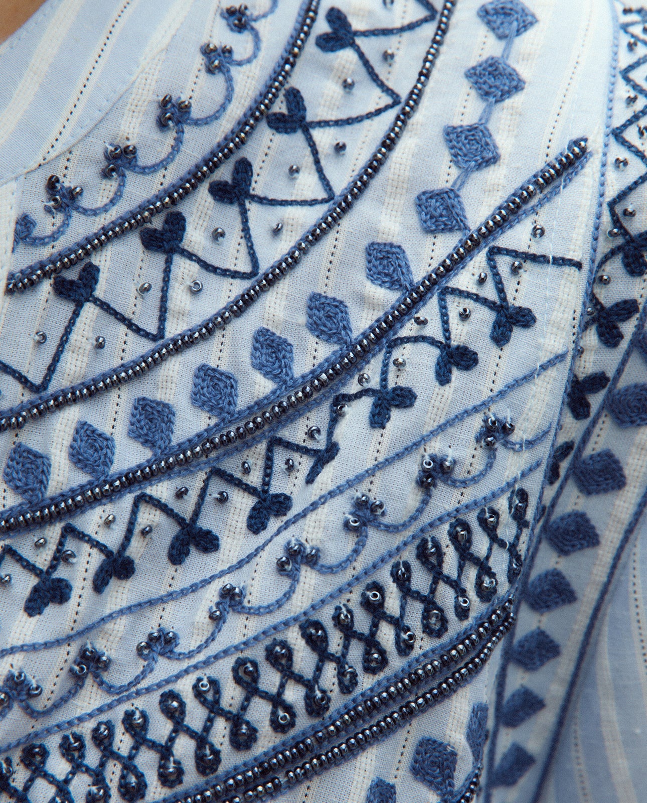 Camisa estampado rayas, cuello mao en forma pico y manga larga. Detalle de bordados con hilo a contraste en marino y pedreria en canesú delantero y puños. Una camisa femenina y muy en tendecia. Regular