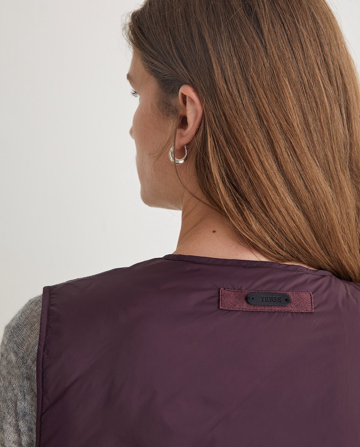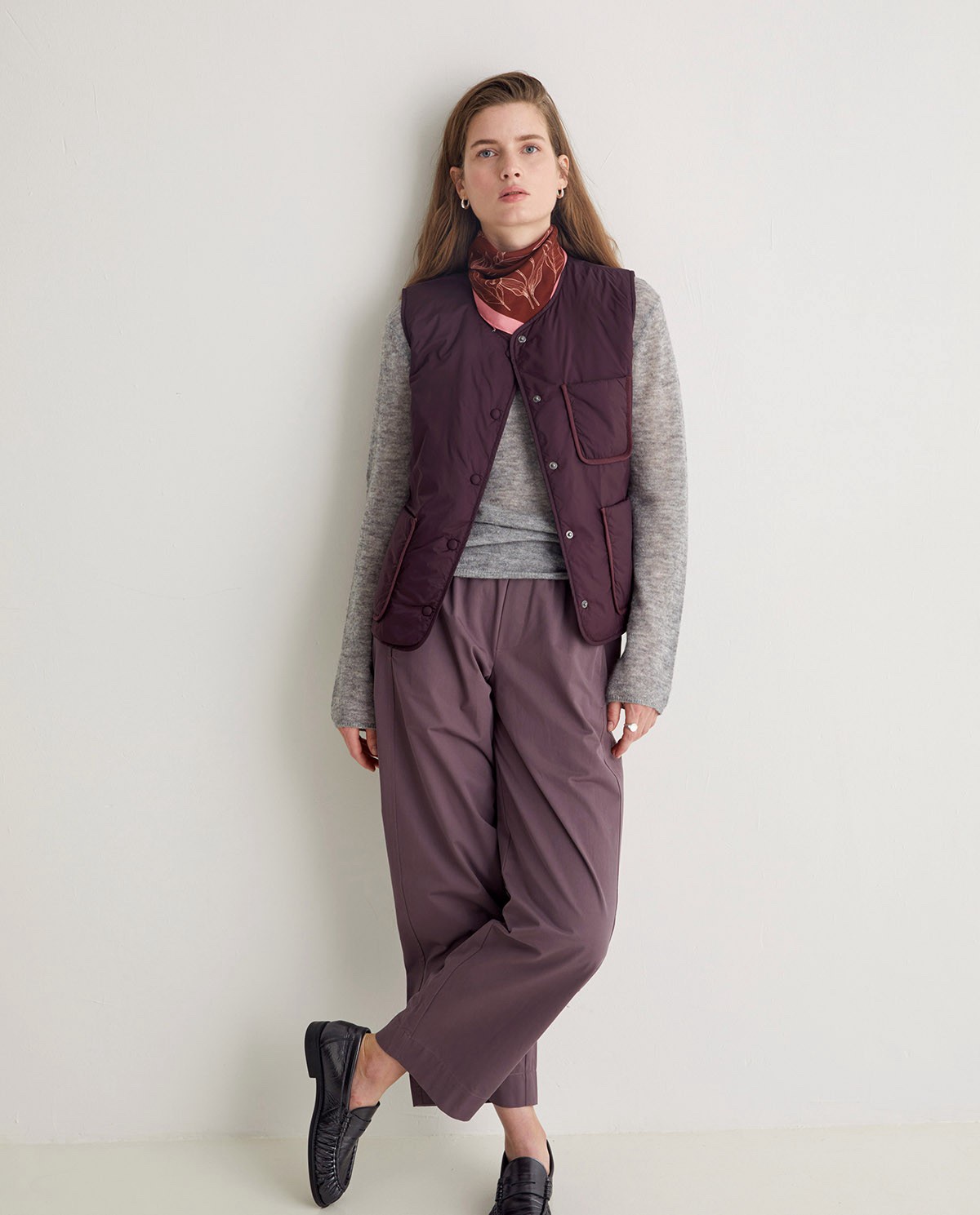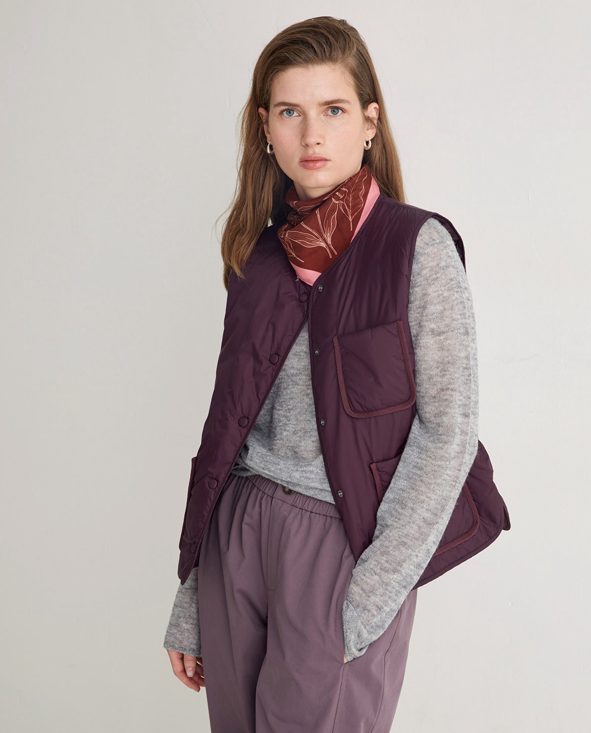 Chaleco water repellent. Tejido con fibras recicladas. Regular fit. Cuello redondo. Sin mangas. Cierre con botones a presión. Aberturas laterales en bajos. 3 bolsillos plastrón con ribete delante y 1 bolsillo interior con cierre de velcro.