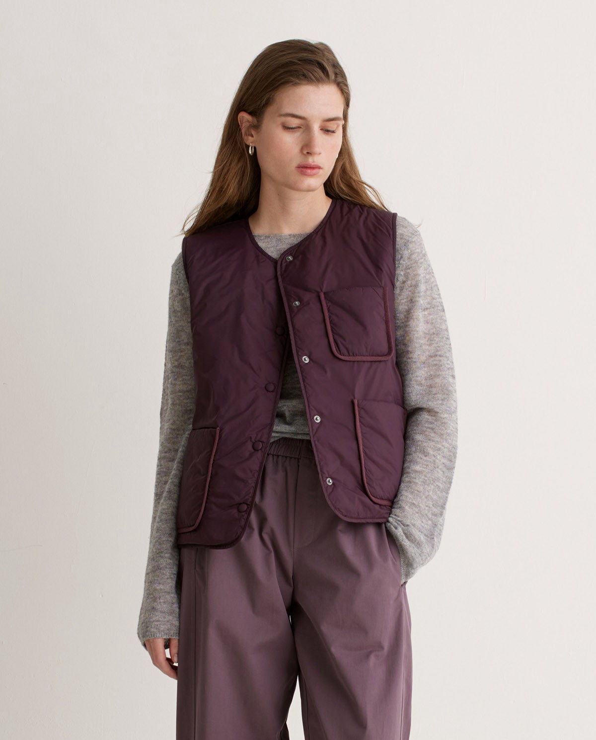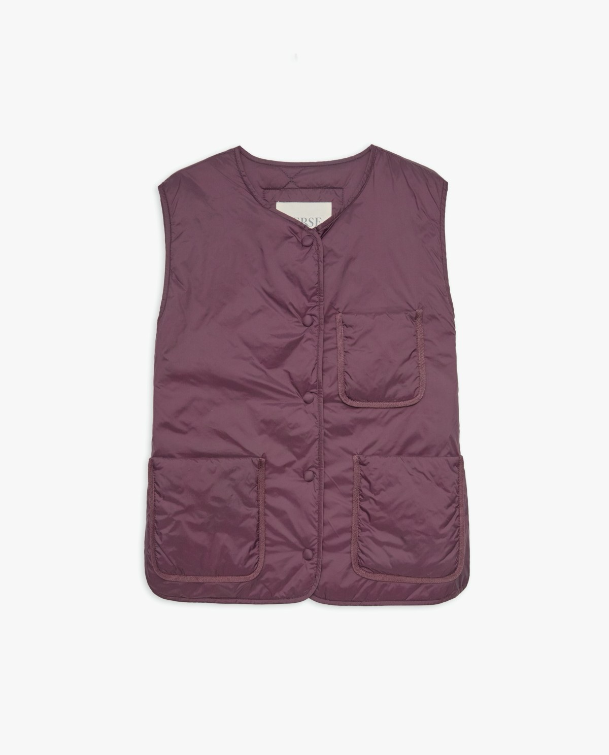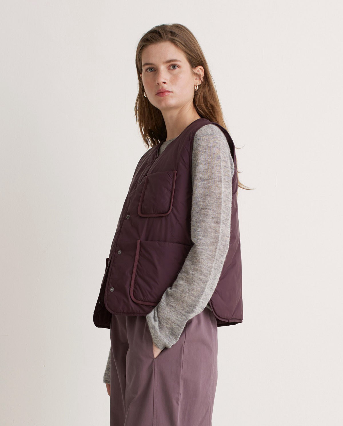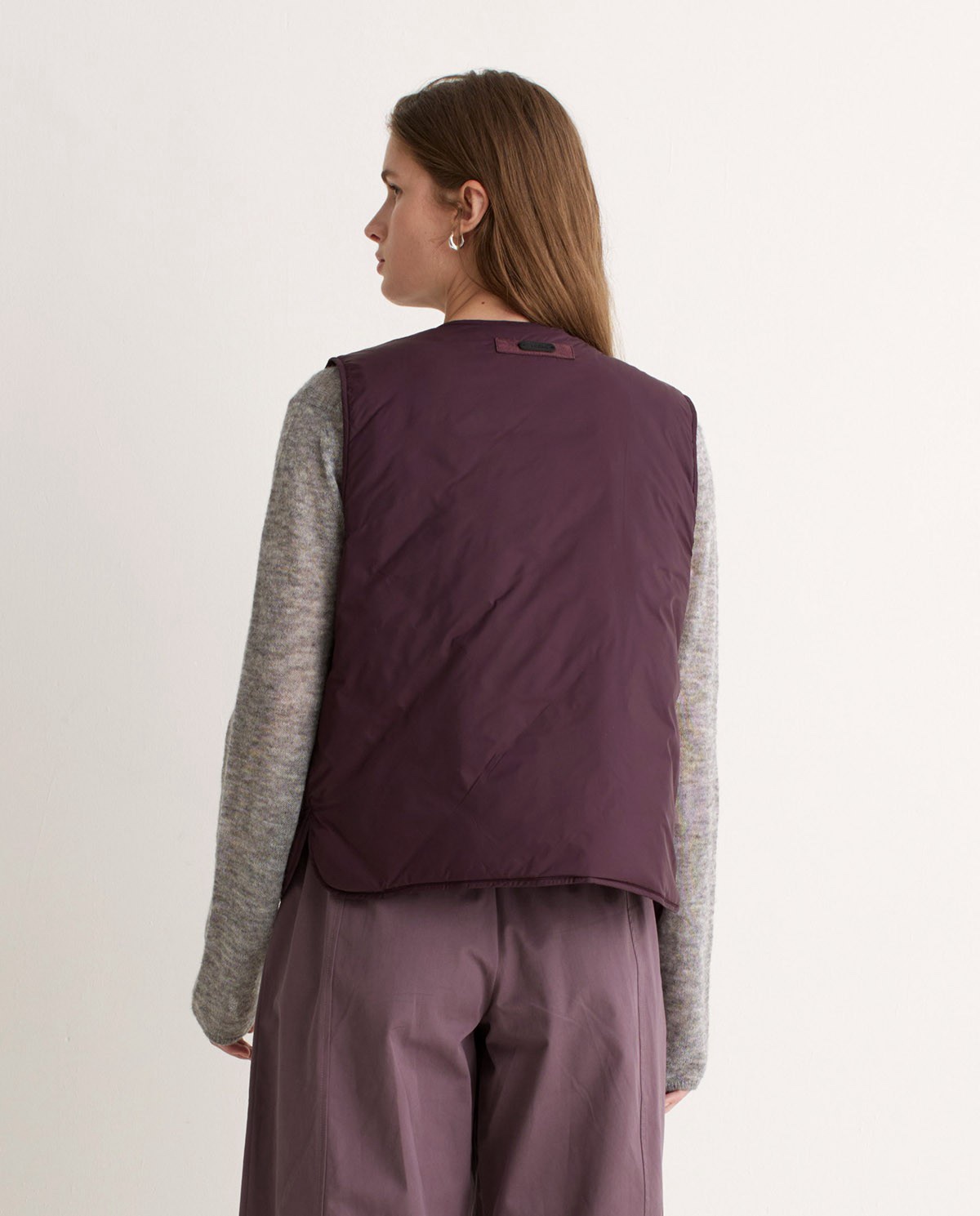 Chaleco water repellent. Tejido con fibras recicladas. Regular fit. Cuello redondo. Sin mangas. Cierre con botones a presión. Aberturas laterales en bajos. 3 bolsillos plastrón con ribete delante y 1 bolsillo interior con cierre de velcro.