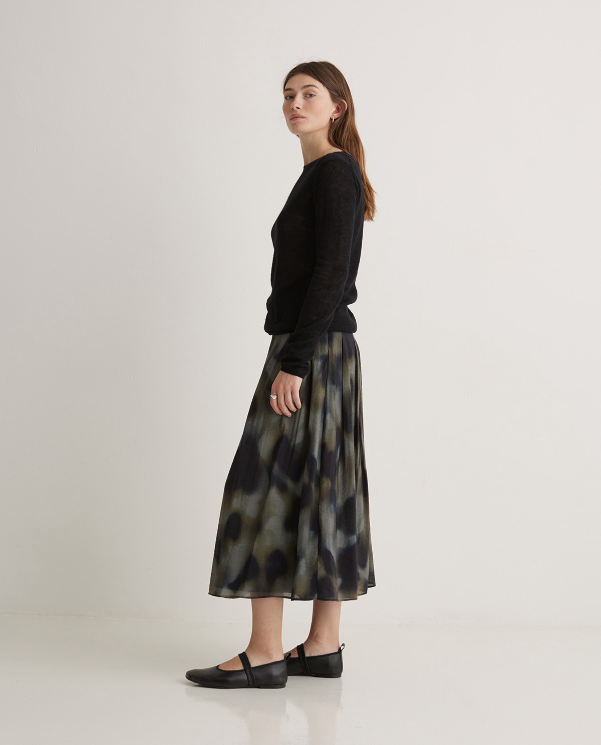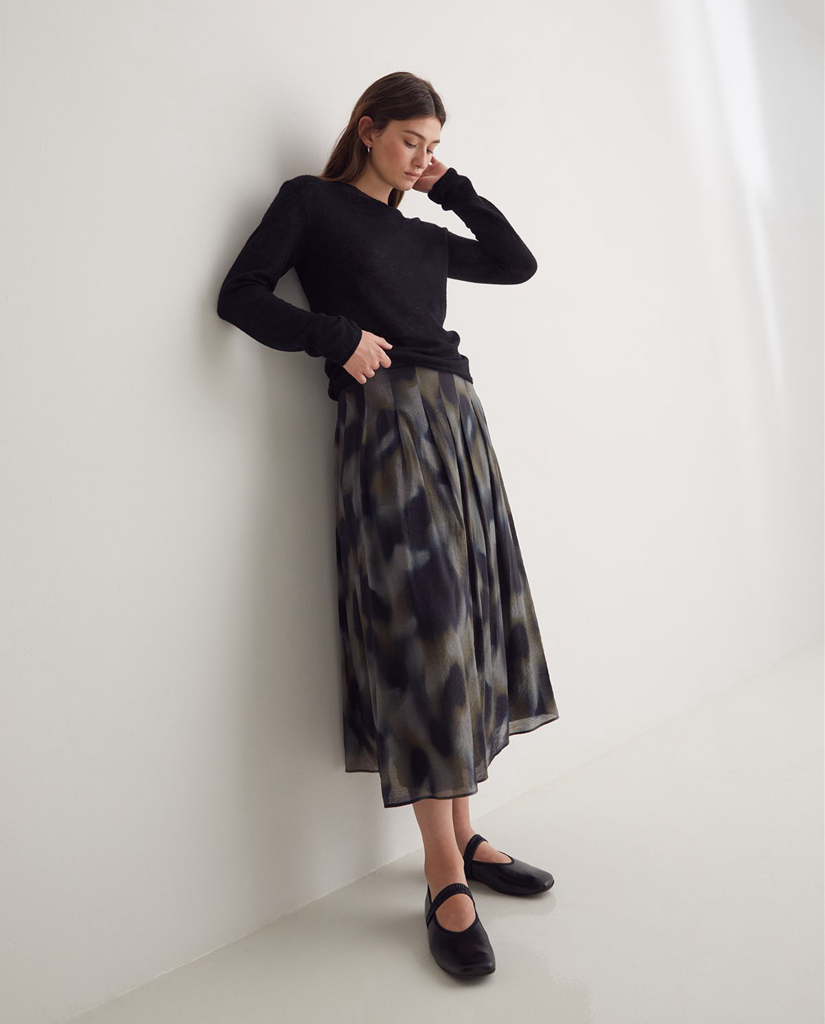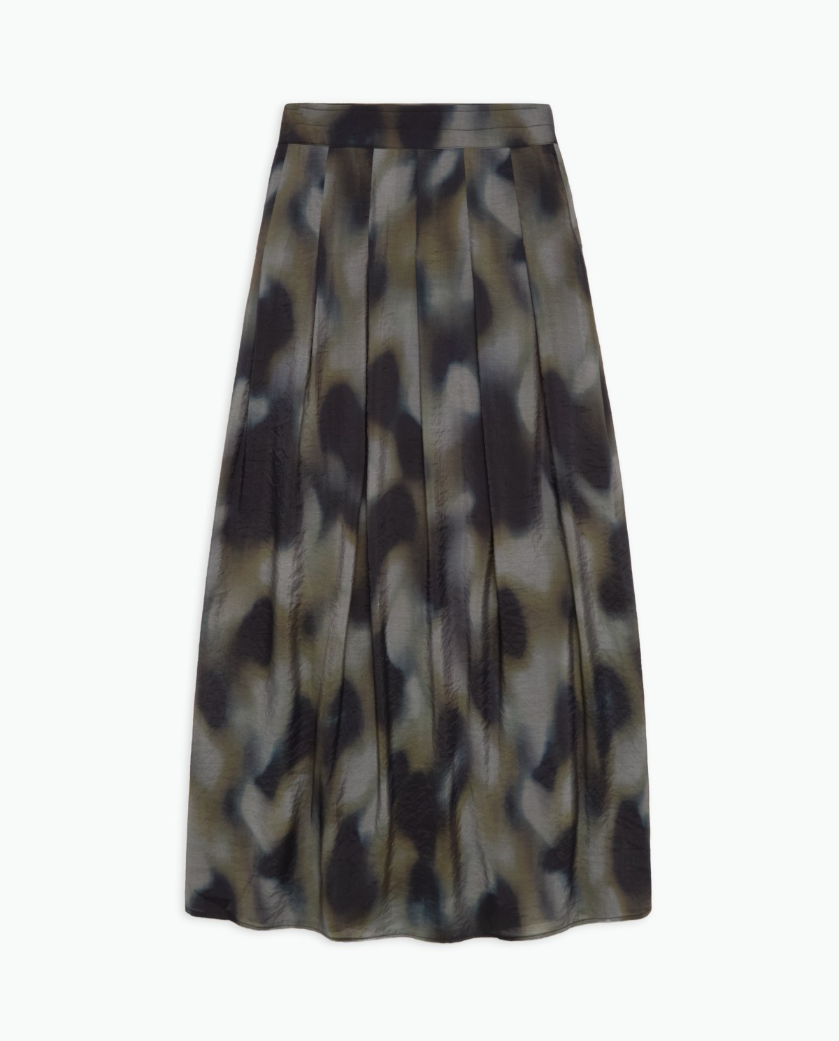Falda midi. Confeccionada con viscosa. Con forro. Estampado multicolor. Diseño evasé. Cierre con cremallera lateral. Detalle pliegues.