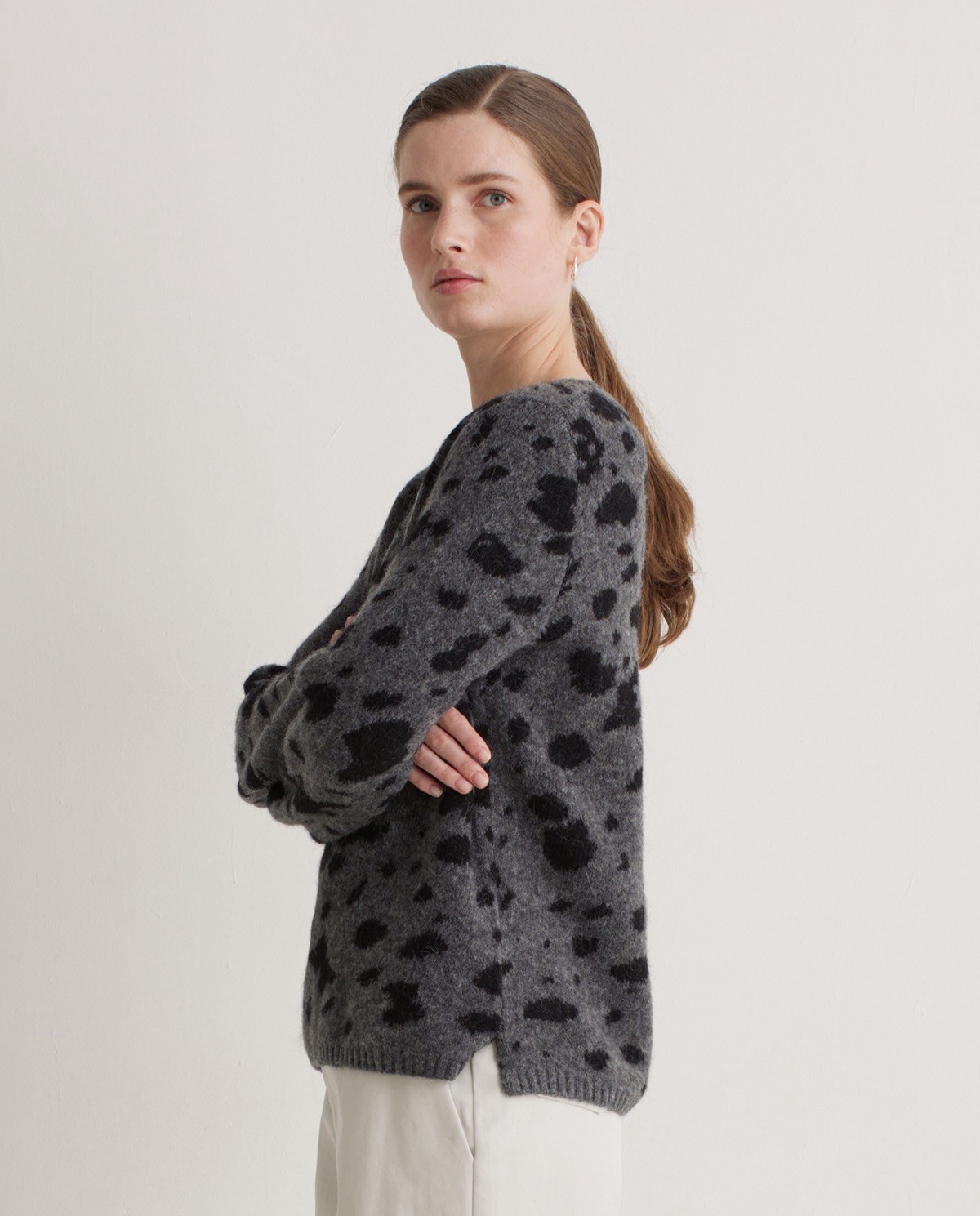 Jersey Jacquard. Tejido mezcla con lana y alpaca. Estampado animal print. Regular fit con aberturas laterales en bajos. Escote pico. Manga larga. Acabados en canalé.