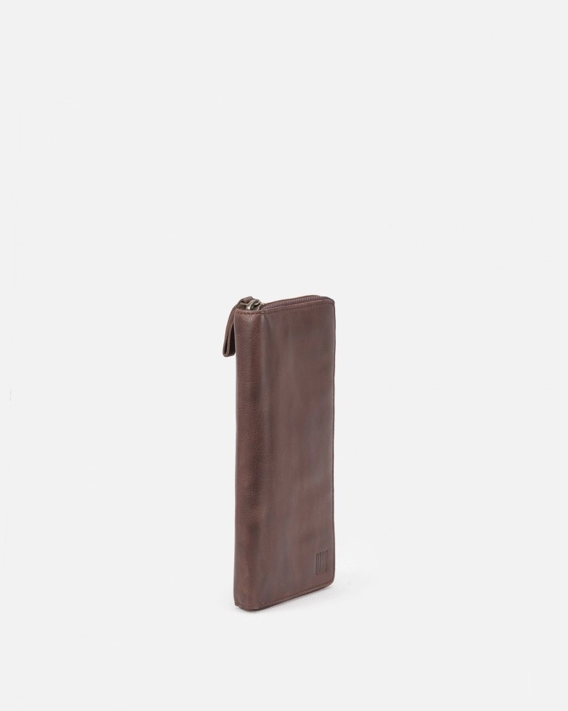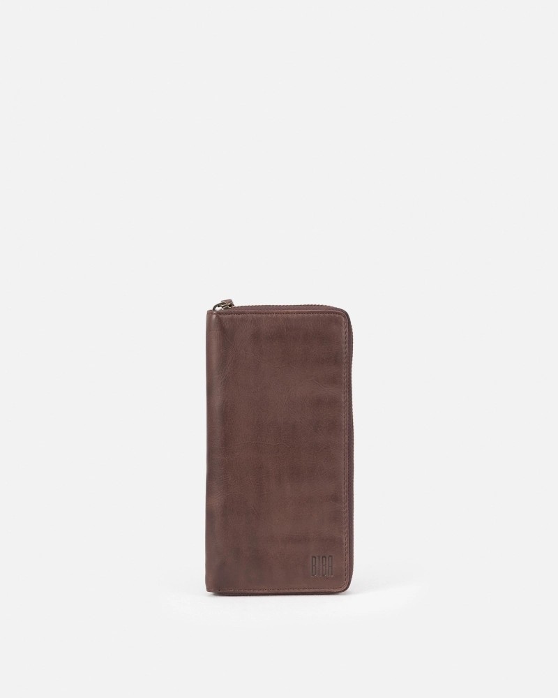 Billetero grande de piel vacuna, lavada, y de curtición vegetal. Cierre con cremallera, compartimientos para tarjetas, billetes, y monedas.