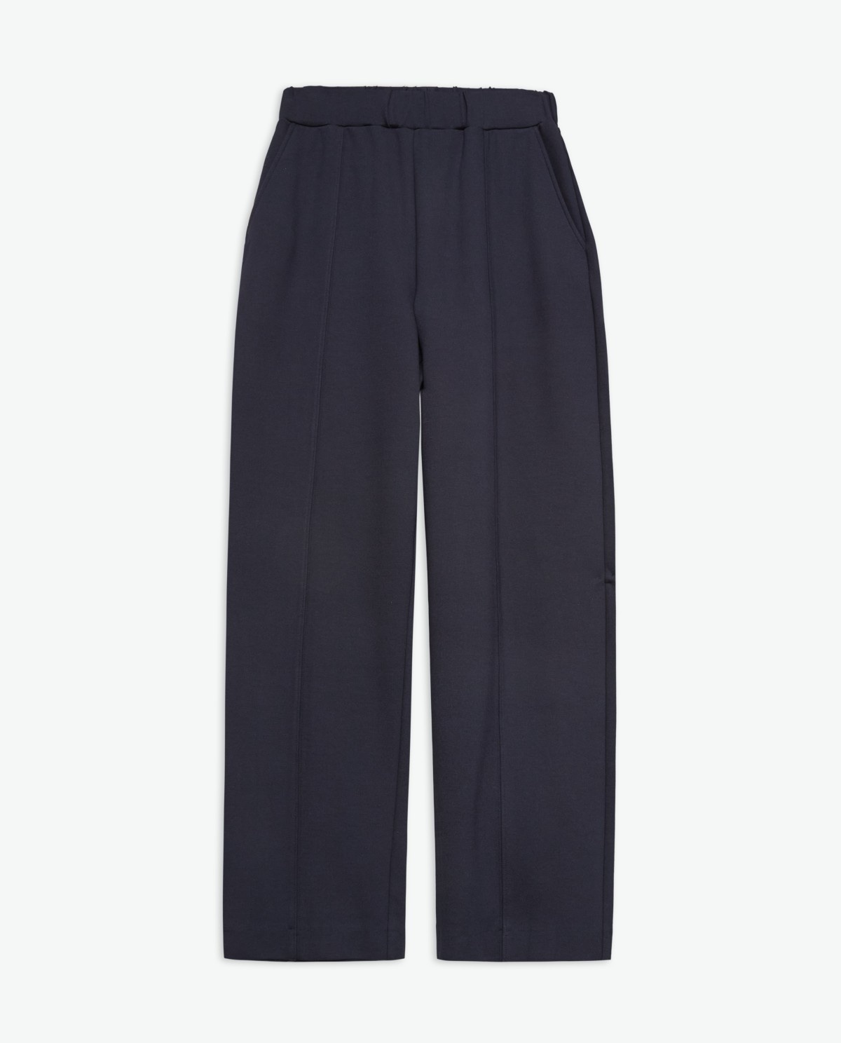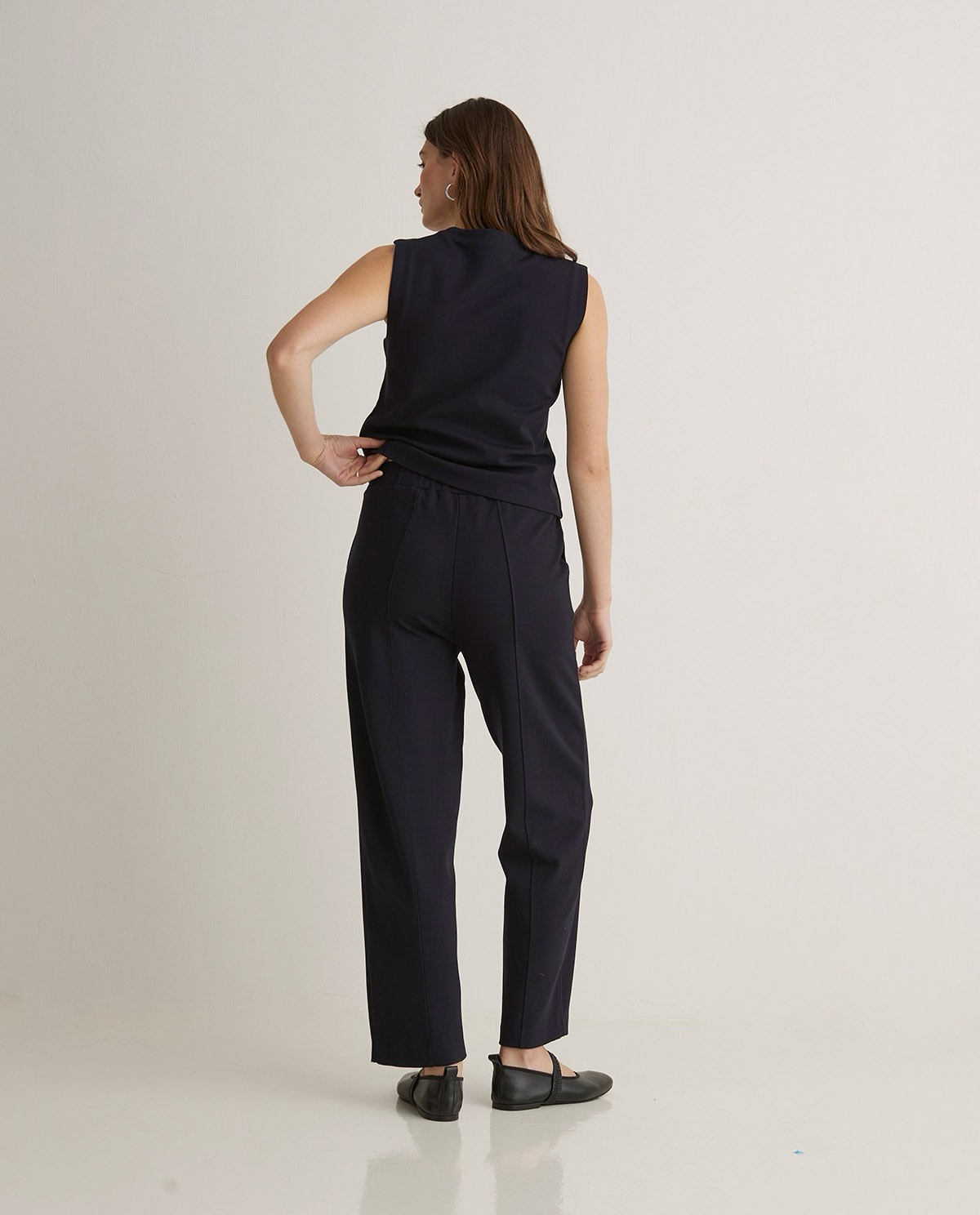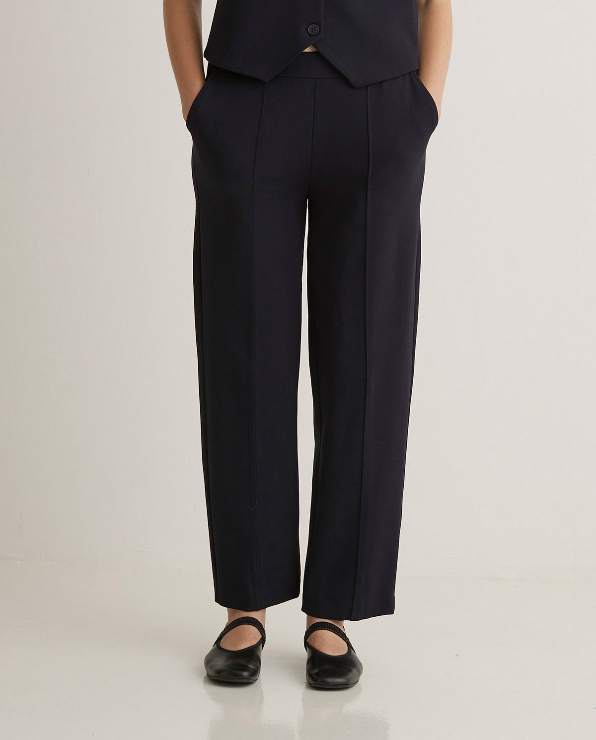Pantalón barrel de punto. Tejido mezcla de viscosa. Cintura elástica. Sin cierre. Costura decorativa vertical. Dos bolsillos laterales.