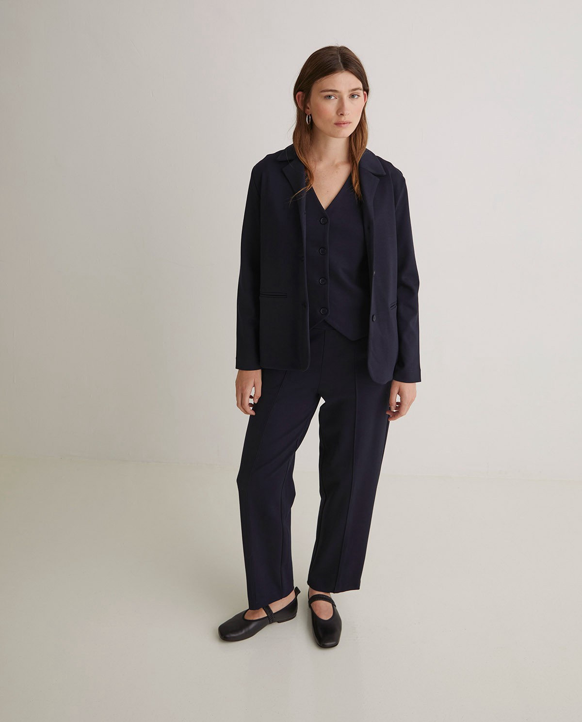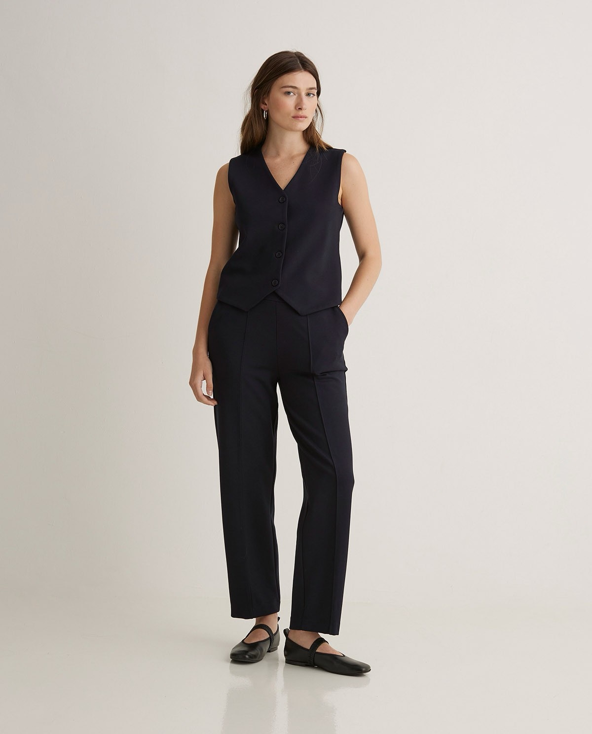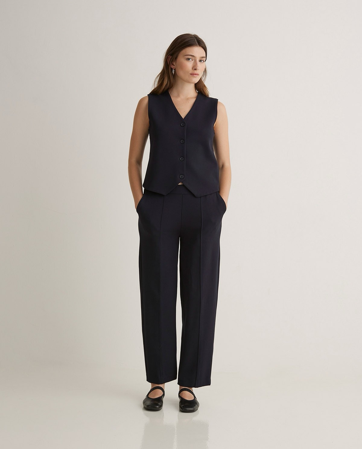 Pantalón barrel de punto. Tejido mezcla de viscosa. Cintura elástica. Sin cierre. Costura decorativa vertical. Dos bolsillos laterales.