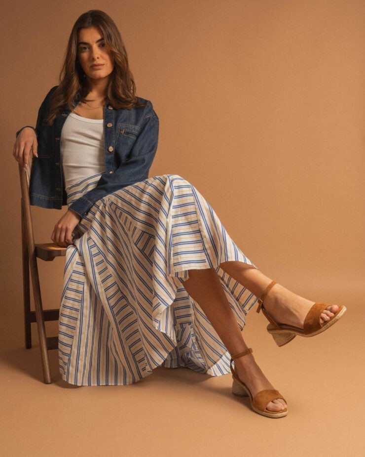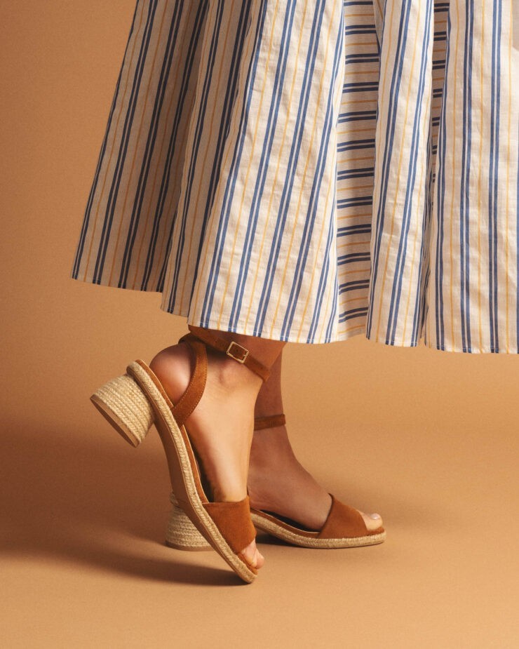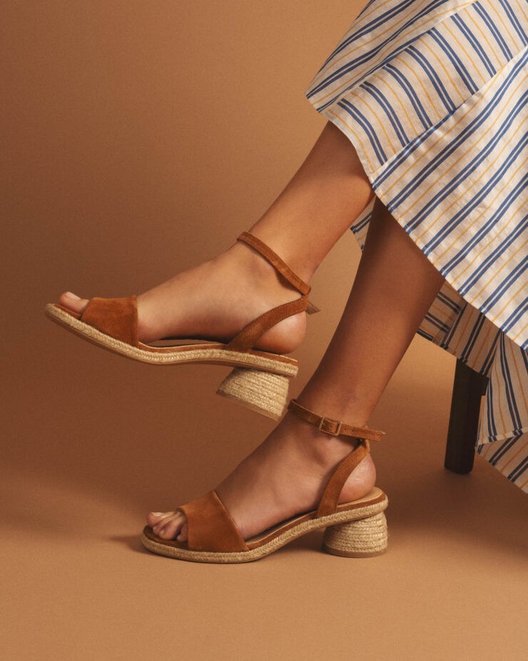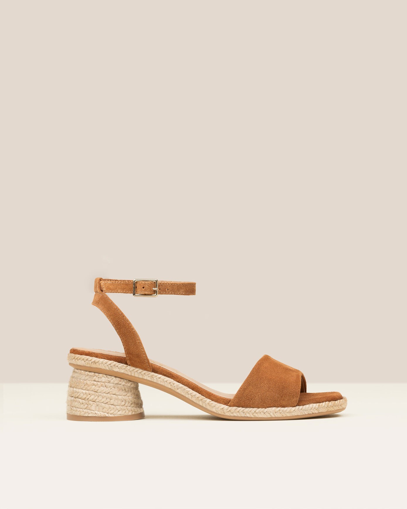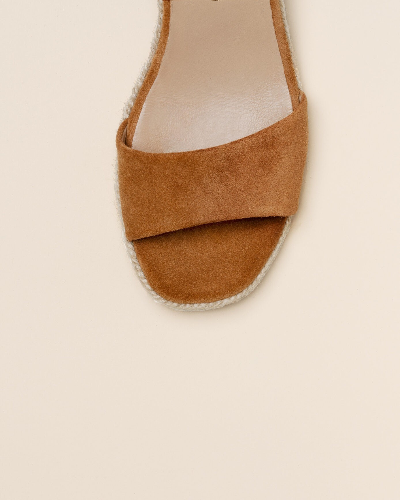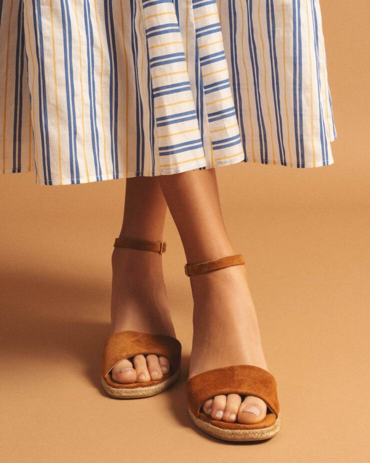 Las alpargatas Evony de Gaimo presentan un diseño natural en suave piel de serraje, con corte y talón abierto, complementados con una delicada pulsera con hebilla lateral. Fabricadas artesanalmente en Arnedo, España, son versátiles y cómodas, perfectas tanto para looks de día como para momentos más especiales.
