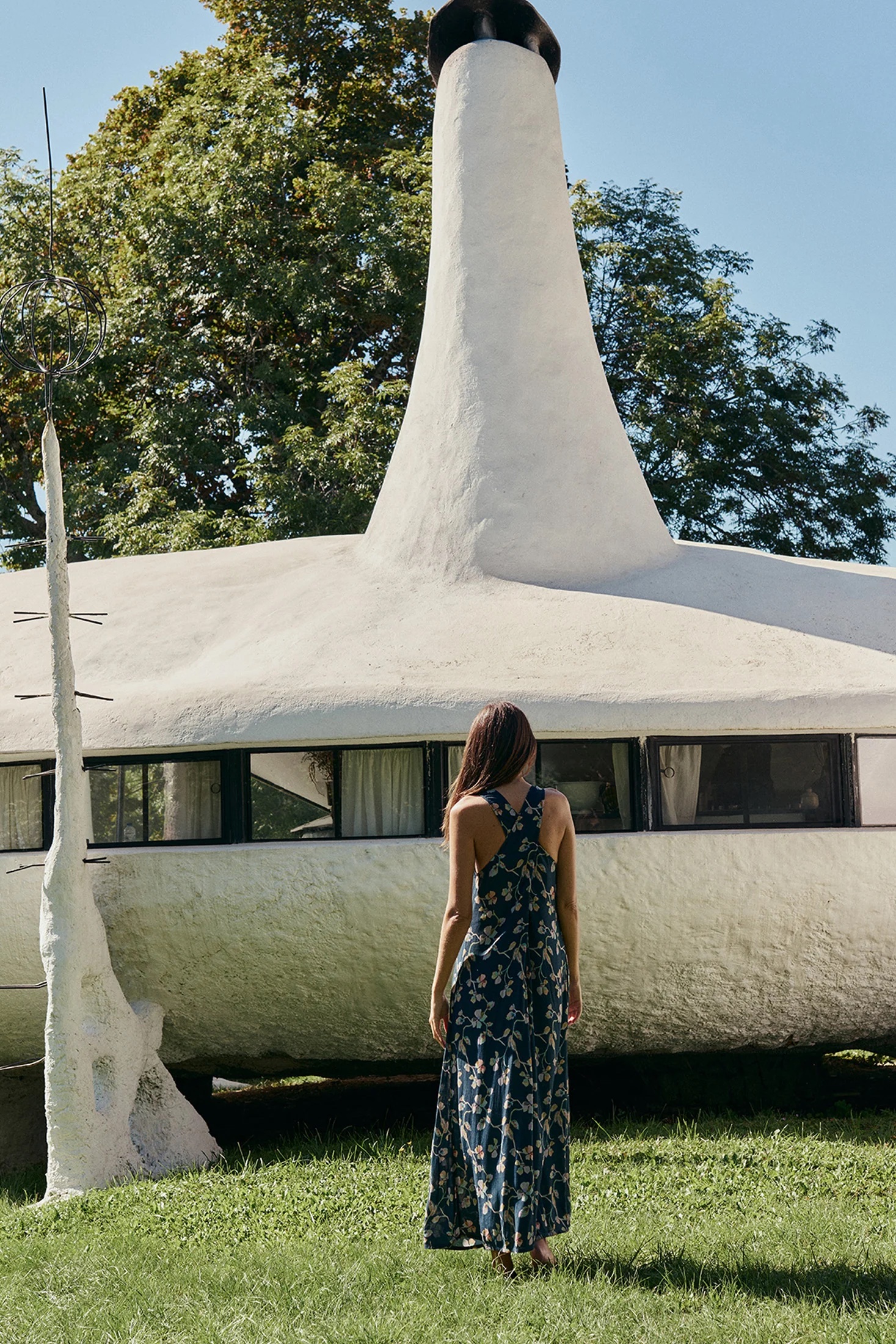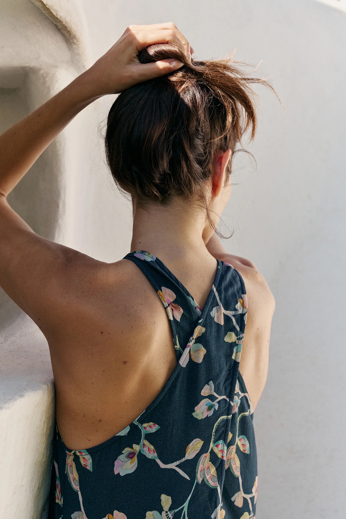 Cuello redondo y escote cruzado en la parte trasera • Bolsillos ocultos en costura • Tejido de viscosa sostenible con print de motivo floral • Fit relajado: Diseñado para que siente ligeramente holgado • Medidas sobre talla S en plano: Largo desde hombro 135cm. Ancho de pecho 43cm. Ancho de bajo 98cm. Tallaje: +1 cm de largo por talla y +2cm en contornos.