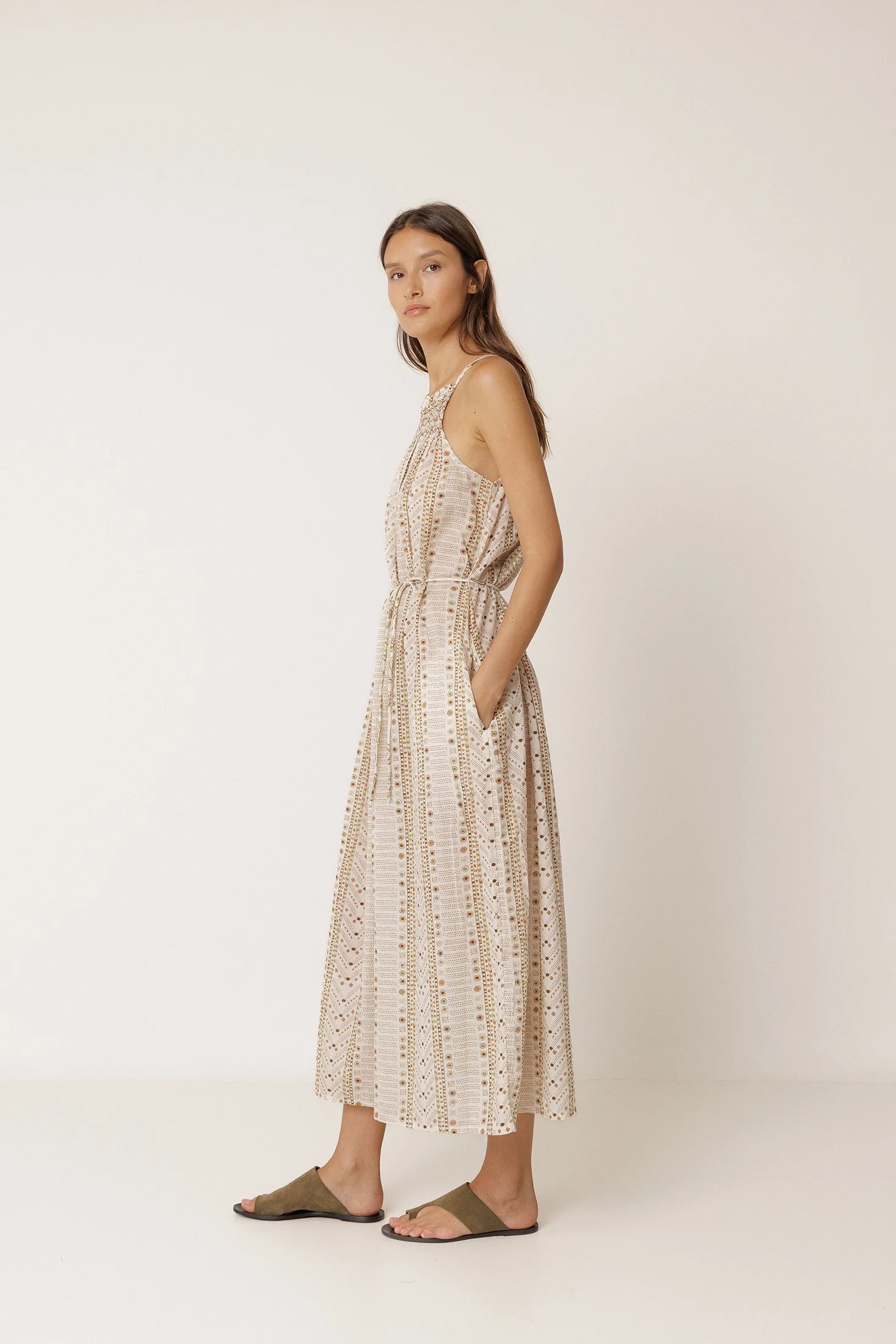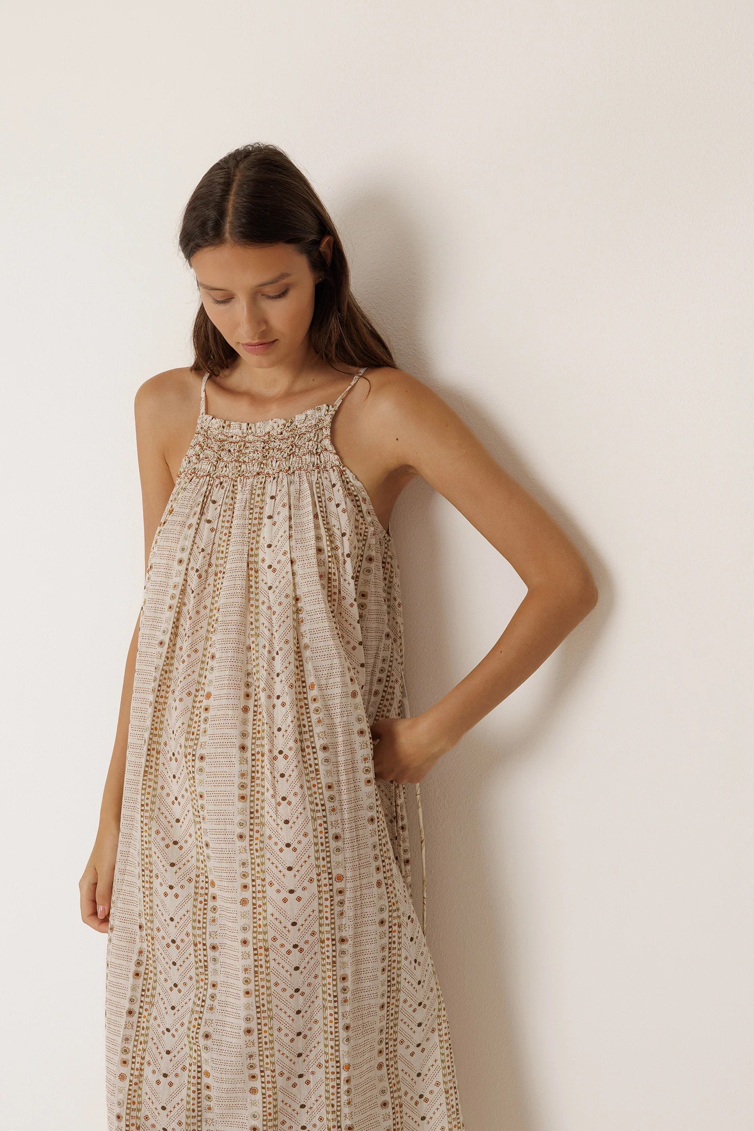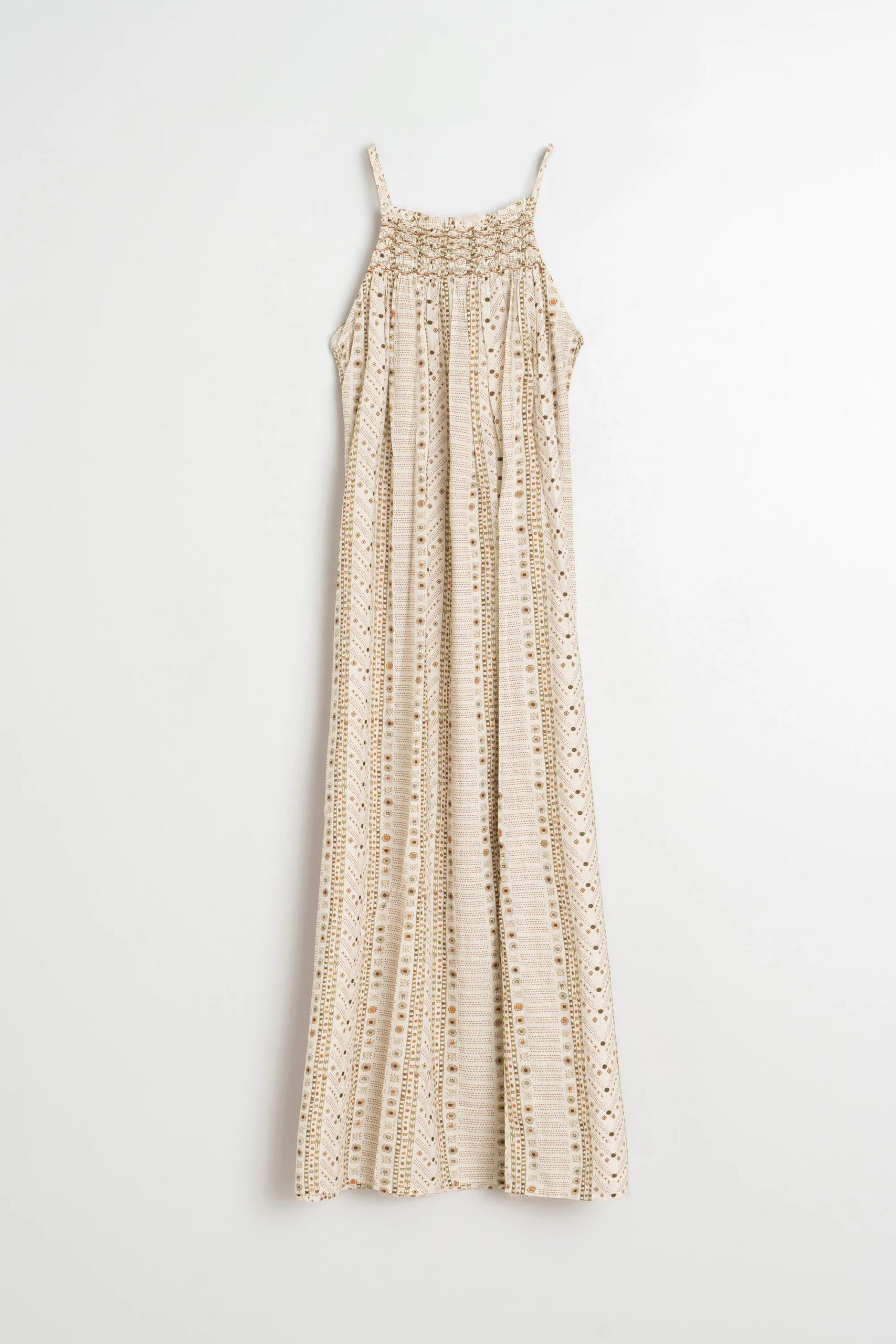 • Escote halter con frunce delantero. • Tirantes finos y hombros descubiertos. •Lazada ajustable y extraíble en la cintura. • Largo tobillero con caída fluida. • Estampados paisley y étnico sobre algodón orgánico. • Fit relajado: Diseñado para que siente ligeramente holgado. • Medidas sobre talla S en plano: Largo desde hombro 134cm. Ancho de pecho 46cm. Ancho de bajo 92cm.